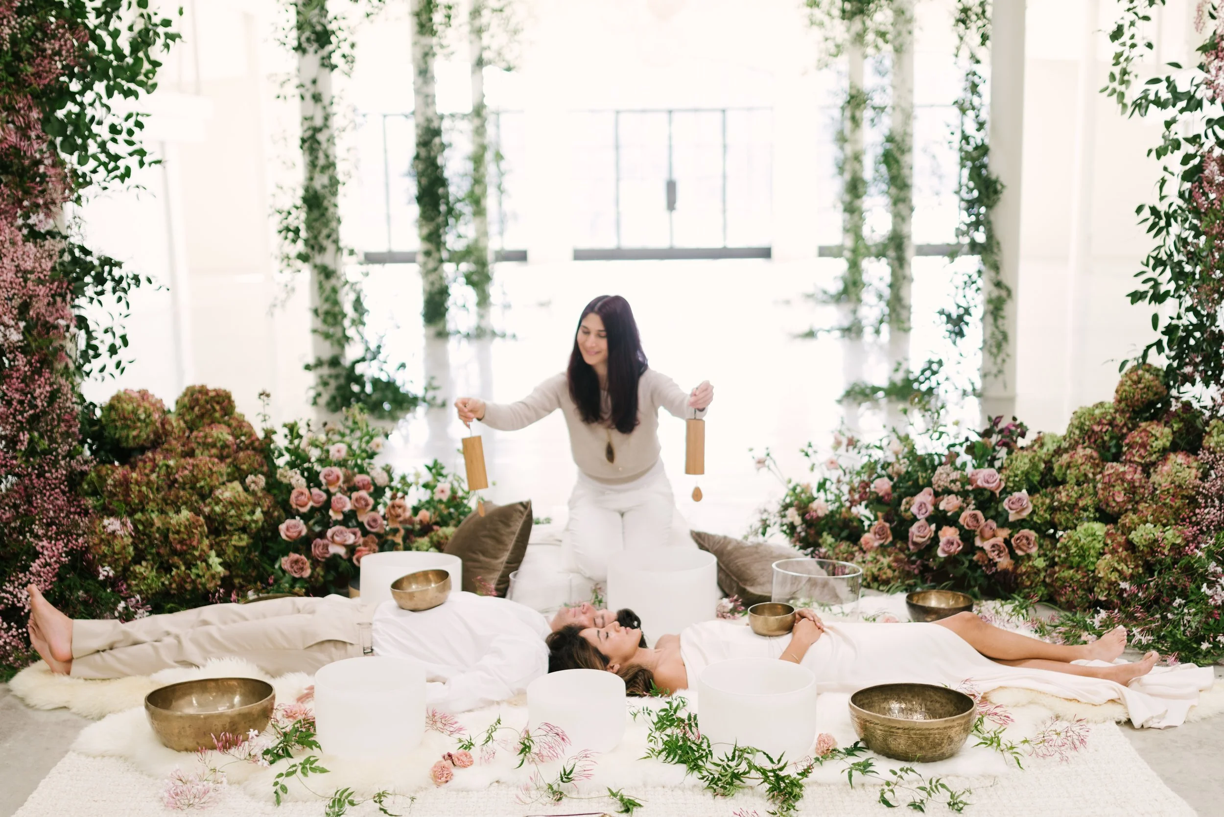 For a wedding event sound healing session, the sound bowl arrangement is tailored for the couple or wedding party. Participants can either lay or sit, relaxing as the soothing sounds of bowls, chimes, and other instruments wash over.